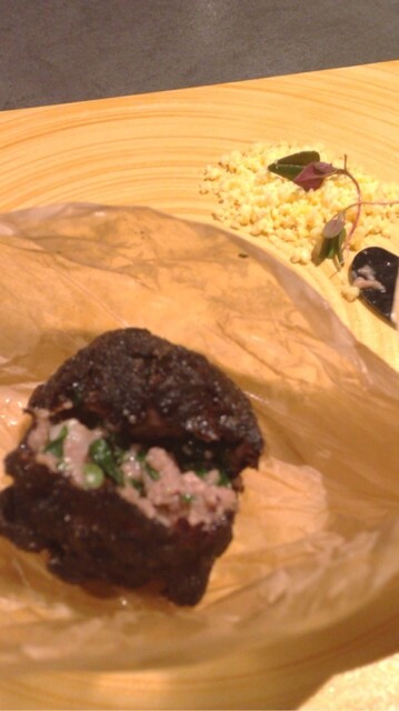 つながり…とスタッフから直接手渡された包みには黒い物体。イカを使った揚げ物ですが、中はトロりでこれまた色々技ありで美味しかったです。