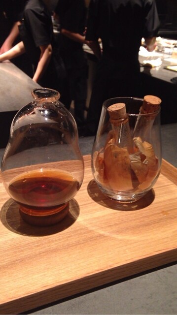なんとウイスキー。一晩ほうじ茶につけて香りを抽出したもの。試験管に入ってるのはなんと玉ねぎのエキス。目の前で実験みたく入れてから出してくれます。