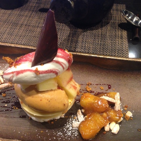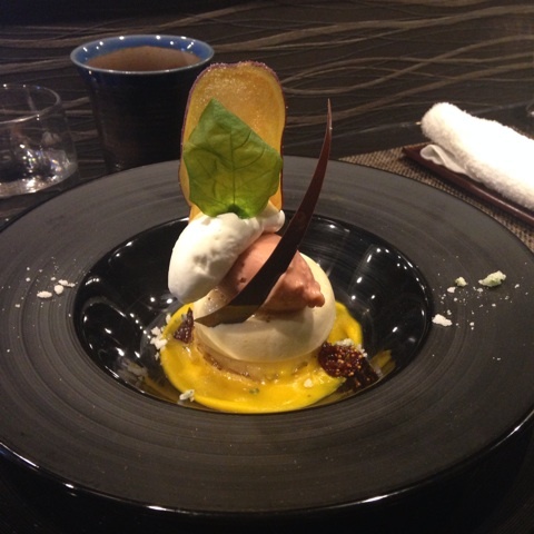 美しくお皿に盛りつけられたデザート!私が選んだのは、柚子とプラリネのアイスを