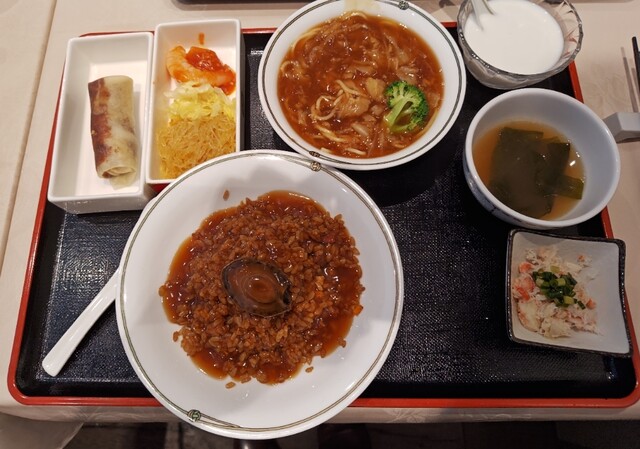 主食はフカヒレ、アワビ、蟹と、スープそば、焼きそば、チャーハンの好きな組み合わせで出してくれます。