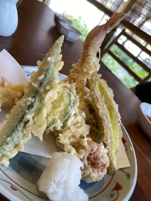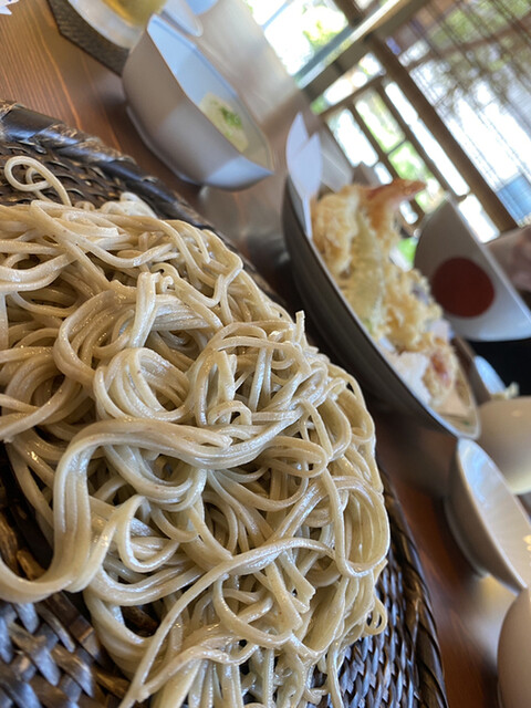 後半は日本酒を数杯、最後は蕎麦焼酎ソーダに切り替えて、締めの天ざるへ。海老天の衣は軽やかで、冷たい蕎麦との相性が抜群。