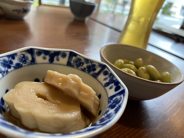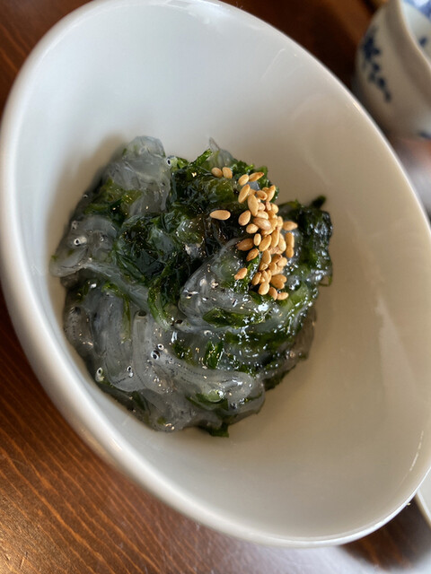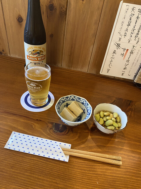 まずはビールで乾杯。酒類を頼むと出てくるお通しが毎回楽しみで、今回は昆布、ささみとわかめときゅうりの酢味噌和え。ささみがちゅるちゅると柔らかく、わかめの食感と酢味噌の酸味が心地よい。こういうひと皿が最初にあるだけで、ぐっとお酒が進む。