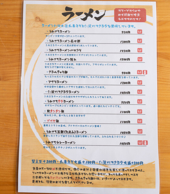 今日は桂浜公園に位置するラーメン屋を訪れました。看板メニューの「うみさちラーメン」を注文したところ、ホンビノス貝が使用されたシンプルであっさりとした味わいが印象的でした。飲みすぎた翌日にはぴったりの一杯で、特に脂っこいラーメンに慣れた中年層には受け入れられる味かと思います。しかし、ラーメン半チャーハンを好む若い世代には物足りなさを感じるかもしれません。