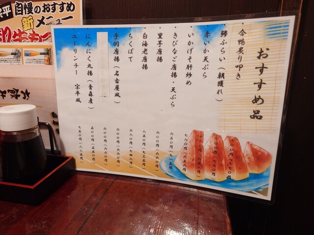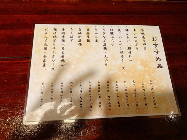 料理メニュー豊富で、特に「五島列島直送のお刺身」「なめろう」や「ささみ梅しそ揚げ」「皿うどん」などがおすすめです。信州諏訪の日本酒「神渡」など厳選された地酒も楽しめます。日本酒はメニューに無いものも多く好みを伝えると複数瓶を見せて説明して頂けて、好みのものを選べます。そして日本酒のお値段が一番高いもので800円!この安心感とコスパが魅力です。