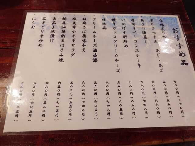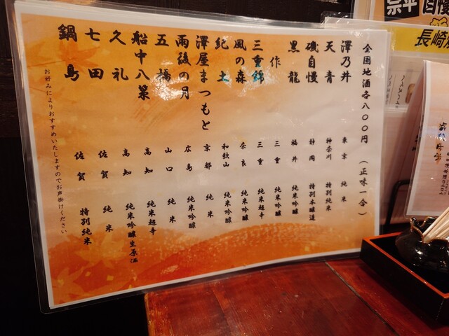 料理メニュー豊富で、特に「五島列島直送のお刺身」「なめろう」や「ささみ梅しそ揚げ」「皿うどん」などがおすすめです。信州諏訪の日本酒「神渡」など厳選された地酒も楽しめます。日本酒はメニューに無いものも多く好みを伝えると複数瓶を見せて説明して頂けて、好みのものを選べます。そして日本酒のお値段が一番高いもので(税込み)880円!この安心感とコスパが魅力です。
