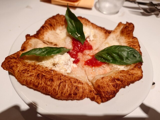 ピザは店名を冠した「ラ バレーナ」、もちもち生地と香ばしい揚げ加減が絶妙で冷たいリコッタチーズ、バジルとの相性が抜群。