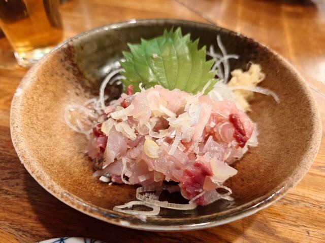 この日はイチオシメニューのイワシ刺しが品切れで、アジたたきを頼む。