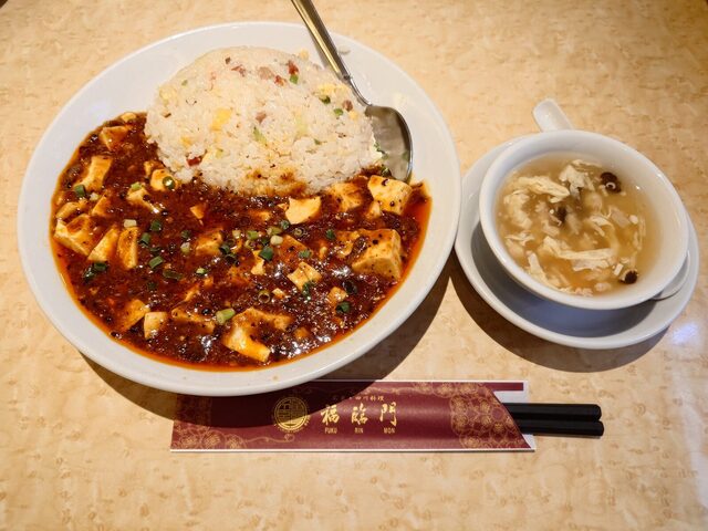 がっつり系メニューの代表。五目チャーハンに麻婆豆腐掛け。夜までお腹すきません。