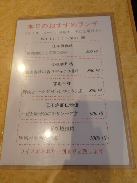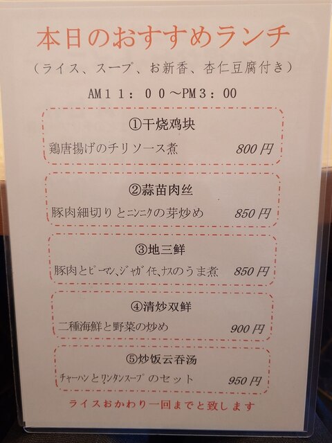 中華料理福臨門 店内掲示メニュー