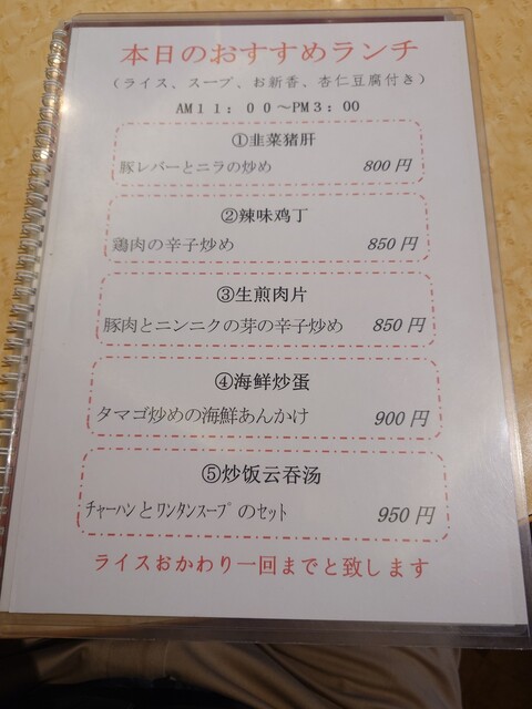土日祝日はランチはありませんがAセット:エビチリ、Bセット:青椒肉絲、Cセット:ラーメンとチャーハン等の定食はいつでも食べられます。