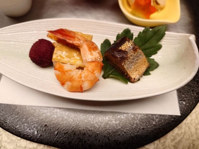 そして何より名物の「朝から舟盛り」。金目鯛の姿造りを中心に、アジたたき・ブリ・甘えびまで揃っていて、朝食の域を超えた豪華さ。鮮度の良さと身の甘みがしっかり感じられて、「食べるお宿」を名乗る理由に納得しました。締めのフルーツヨーグルト(ブルーベリーソース)で口の中もさっぱり。全体に丁寧で上質、朝から満たされる朝食でした。
