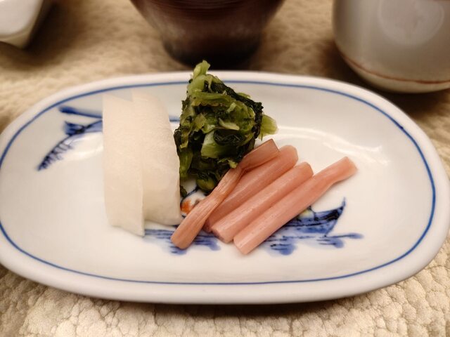 木箱のおかずは、海苔佃煮や塩辛、焼きたらこ、わさび漬けなど「ご飯のお供」がぎゅっと詰まった布陣で、少しずつ味を変えながら最後まで楽しく食べ進められます。蒸し野菜は素材の甘みが出ていて、濃いめのおかずが続く中の良い箸休め。つみれ汁も優しい旨みで、朝の胃にすっと入る感じ。