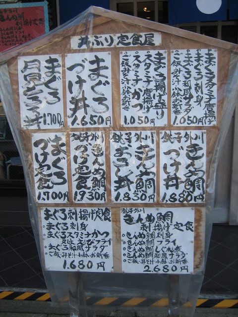 「きんめ鯛刺身」1,630円、「きんめ鯛づけ」1,730円、「きんめ鯛刺・揚げ定食」2,680円、「まぐろ刺身」1,200円、「まぐろづけ」1,500円、「まぐろ刺・揚げ御膳」2,580円など、刺身、づけ、揚げ物等様々な料理が揃っている。残念なのは、ツートップのまぐろときんめ鯛の両方を味わえるメニューが存在しないこと。