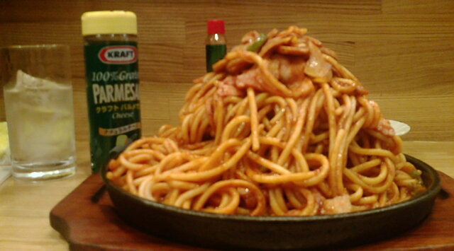 それにしても破壊的なボリューム。さらに、味の濃いナポリタンにしてしまったこともあり途中でくじけそうになる。しかし水で口の中をリフレッシュすれば味自体は好みなので食べ進められる(サラダを残しておけば良かった)。そして、終盤になりタバスコ、さらに大盛スパゲティ界における守護神とも言える粉チーズを最後に投入し、無事完食!