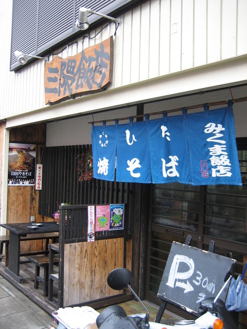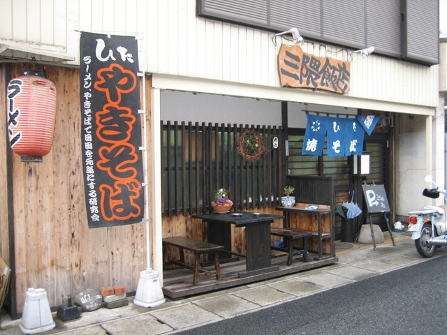 店の前に大きな文字で「やきそば」と書かれたノボリや暖簾がインパクトあり、細い路地にある店ながら視認性はある。