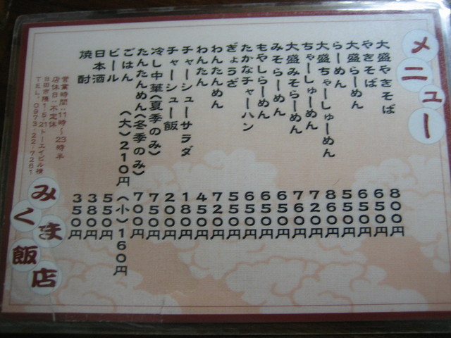 メニューは、「焼きそば」650円(大盛800円)、「ラーメン」550円(大盛650円)、「チャーシューメン」720円、「高菜チャーハン」650円、「餃子」550円など。焼きそばとライスがセットになった「焼きそばセット」というものもあり、こちらは500円とお得。