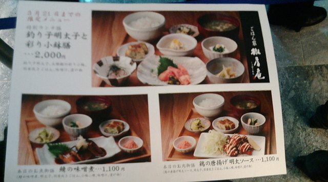 店の内外の壁には魅力的な一品メニューを多数掲げているが、この日提供されていたランチメニューは「釣り子明太子と彩り小鉢膳」2,000円、「鯖の味噌煮」「鶏の唐揚げ明太ソース」各1,100円の3種類のみ。