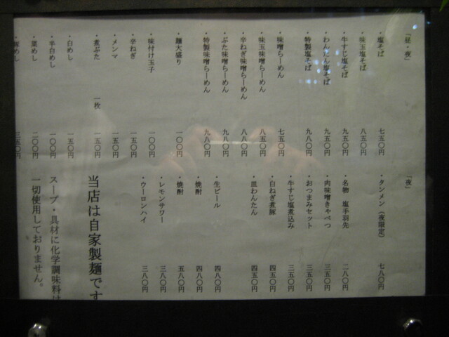 メニューは、塩味の「塩そば」と味噌味の「味噌らーめん」がツートップ。「塩そば」「味噌らーめん」各750円、「味玉塩そば」「味玉味噌らーめん」各850円、「特製塩そば」「特製味噌らーめん」各980円などがあり、一品料理も数種類ある。