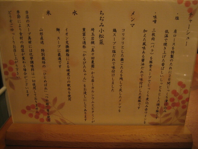 自動券売機方式だったためサービスは最低限なのかと思ったが、店員の応対はしっかりしており、白木により清潔感のある内装ともども好感が持て、店名に「饗(もてなし)」を冠するだけのことはある。