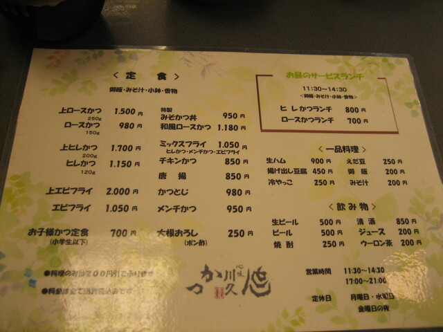 メニューは、「ロースかつ」980円、「ヒレかつ」1,150円、「エビフライ」1,050円、「ミックスフライ」1,050円、「チキンかつ」850円、「みそかつ丼」950円など。「とんかつ」を看板に掲げているものの、とんかつ以外のメニューも結構ある。ロースかつやヒレかつには「上」もある。