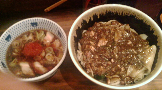 まずは、つけ汁を使わずに麺と肉味噌のみで食してみる。この肉味噌は花椒がかなり効いたもので、口に入れるとすぐに舌の痺れを感じる。それでいて、徐々に麺の持つ甘みとうまく調和していくのが分かる。つけ汁をつけなくてもこれだけで十分食べられると思える完成度。「一反も麺」のピロピロした形状が口の中で独特な動きをする。