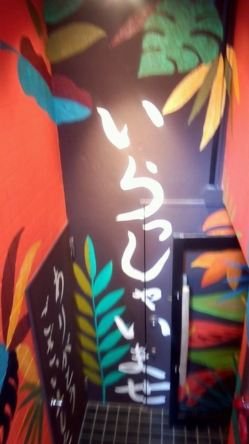 階段を降りると原色を組み合わせたような妖しい色合いの壁があり、そこに「いらっしゃいませ」と白い文字で書かれている。そのまま店内に入るが、店内も同様な妖しい色使いで少々落ち着かない。