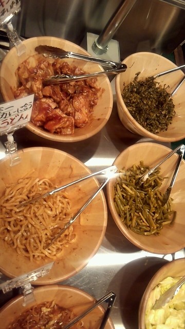 千切りキャベツ、千切りセロリ、オクラ、コーン、ヤングコーン、サルサなど。高菜やキムチ、らっきょうなどもこのコーナーに置かれている。