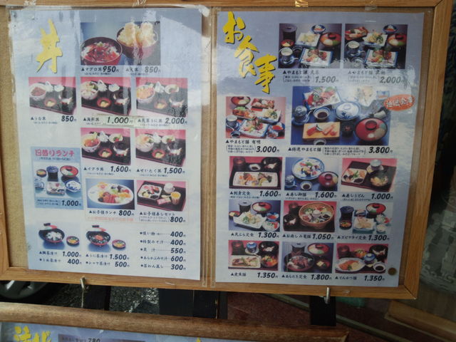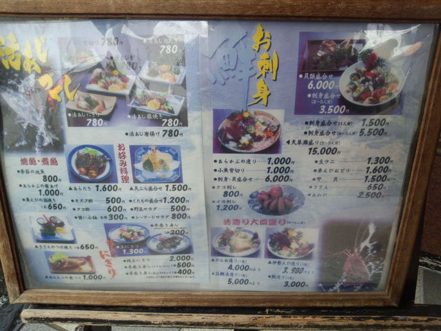 メニューは魚介類を中心とした一品料理が各種あるが、昼夜とも食べられる定食系メニューは、「有明御膳」3,000円、「黒潮御膳」「うに丼」各2,000円、「刺身定食」1,800円、「ぜいたく丼」1,500円、「マグロ丼」「海鮮丼」各1,000円など。