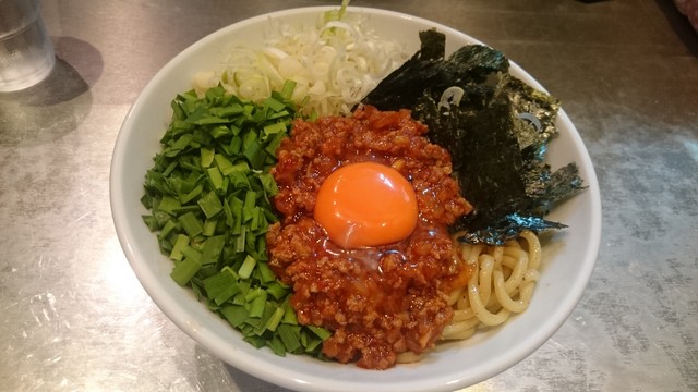 大きな丼の上に麺、その上に刻みニラ、刻みネギ、肉味噌、もみ海苔、中央に卵黄がのっている。