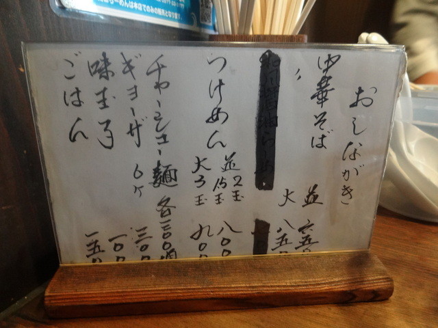 メニューは、「中華そば」並650円・大850円(チャーシュー麺は各300円増し)、「つけめん」並(1.5玉または2玉)800円・大(3玉)900円、「餃子」300円。ちなみに、入口扉にもメニューは掲げられていたが、そちらは英語表記のみ。