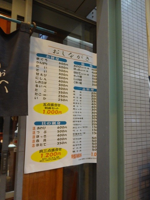 メニューは、「刺身5点盛り合わせ」1,000円、「貝三点盛り合わせ」1,200円をはじめとした刺身類、「ホッケ焼」300円などの焼き物、「マグロ丼」500円、「特盛海鮮丼」1,000円など。一品料理はほとんど300円前後とお手頃。