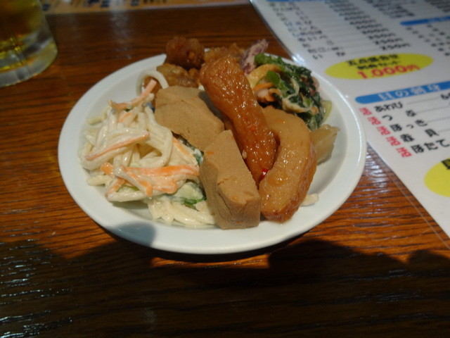お通しは強制的に300円つけられているが、このお通しが何とビュッフェ形式。入口近くのビュッフェ台から、練り物やひじき、マカロニサラダなどを自分で好きなだけ皿に盛って席に持っていく仕組み。なお、お替りはできない模様。