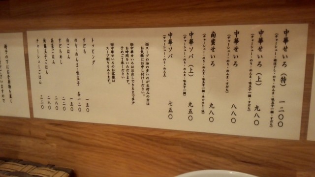 メニューは、「中華せいろ」880円・上980円・特1,200円、「南蛮せいろ」980円、「中華そば」750円・上950円。サイドメニューになるご飯ものもあった。店外には「つけ麺」を掲げながらメニュー名は「せいろ」というのが面白い。