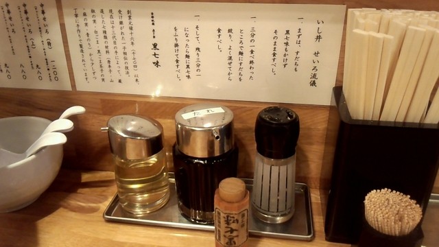 店内はラーメン店というより和食の店のイメージに近い落ち着いた雰囲気で清潔感がある。BGMが三味線の音を使っているので余計にそのように感じる。席はカウンター席のみで、厨房を囲むように13席。カウンターには色々な能書きや黒胡椒をはじめとした調味料が置かれている。水はセルフサービス。