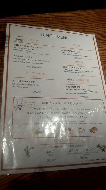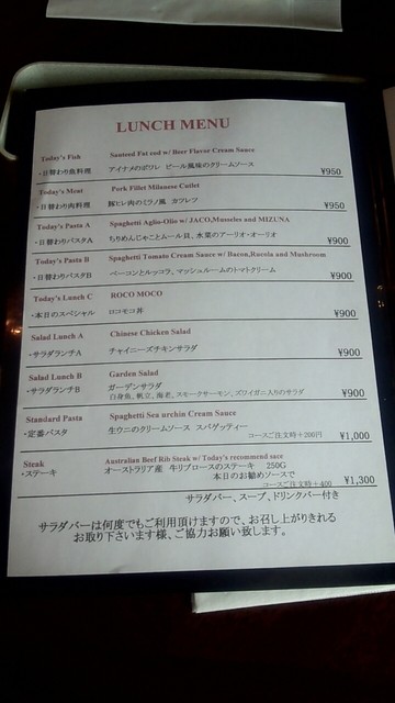 ランチメニューは、「日替わり肉料理」「日替わり魚料理」各950円、「日替わりパスタ」2種類・「本日のスペシャル」・「サラダランチ」2種類が各900円、「生ウニのクリームソーススパゲッティー」1,000円、「牛リブロースのステーキ」1,300円など。コース料理もあった。