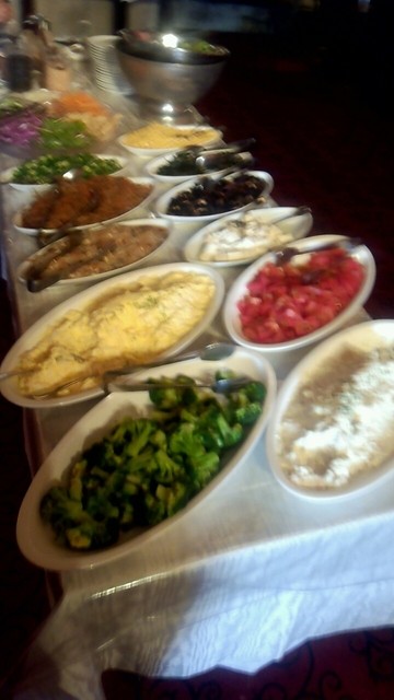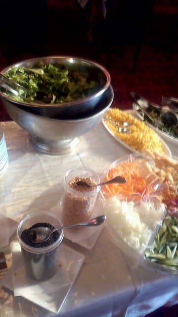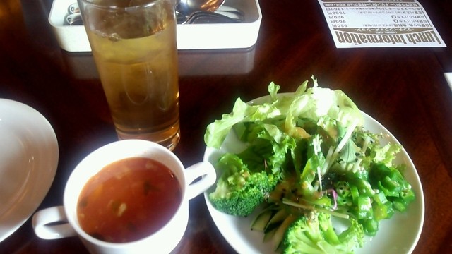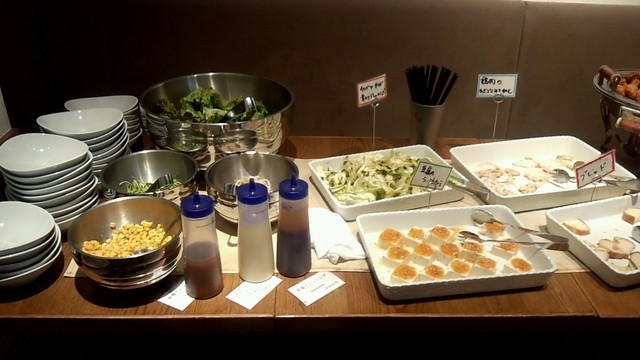 サニーレタス、ブロッコリー、ゴボウ、たまごサラダ、ポテトサラダ、キュウリ、トマト、ニンジン、紫オニオン、海藻、ヤングコーンなど15種類ほどあり充実している。ドレッシングも自家製をはじめ4種類ある。