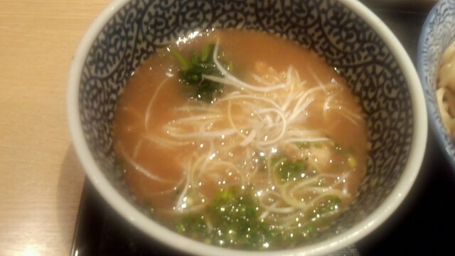 つけ汁は動物系と魚介系の風味が混じり合ったとろみのあるものだが、鶏の風味が前面に感じられ、豚骨メインのつけ汁とは異なり重さを感じない。「濃厚」を謳っていながら味の強さとパンチで攻めるのではなく、飲みやすさとまろやかさが特徴。
