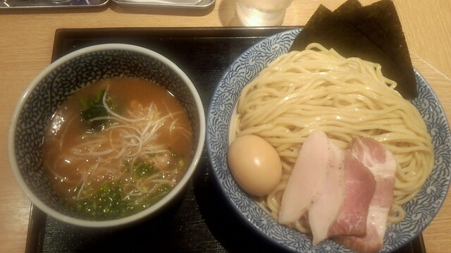 つけ汁の中にはチャーシュー、メンマ、海苔、ネギが入っており、一方の麺には卵が添えられている。チャーシューは炙られた風味が感じられるもの。麺をつけ汁の中に投入すると時折絡んでくる海苔の風味がスープと合わさっていい感じ。
