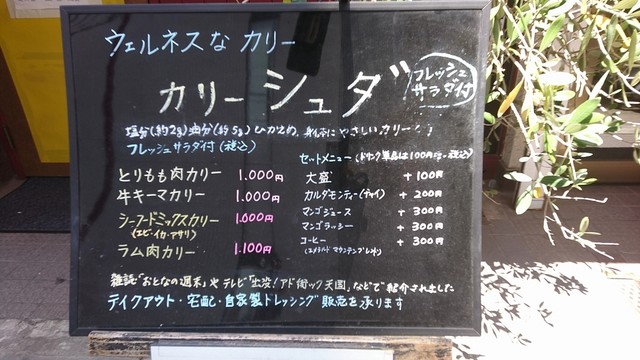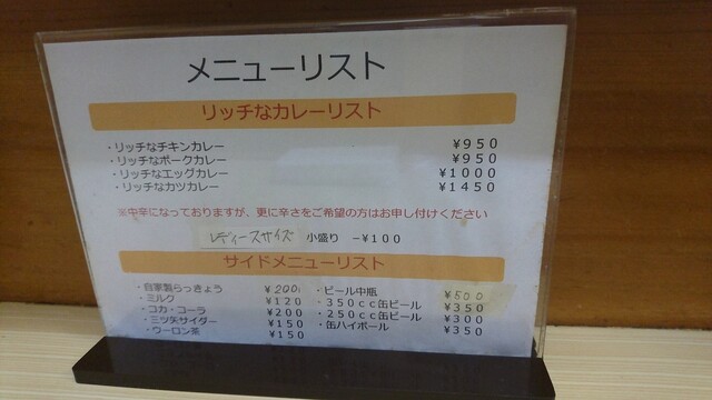 メニューは、「リッチなチキンカレー」「リッチなポークカレー」各950円、「リッチなエッグカレー」1,000円、「リッチなカツカレー」1,450円。ドリンク類が数種類ある。メニュー表に大盛りの記載はなかったが、レディースサイズとして小盛りが各100円引きで設定されている。