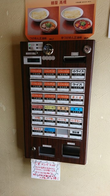 メニューは、「つけめん」「辛つけめん」が小750円・中800円・大850円、「みそつけめん」が小780円・中830円・大880円、「おさかな正油らーめん」800円など。ライスや各種トッピングもあるものの、サイドメニューやアルコール類の提供はなくつけめんとらーめんに絞っている印象。
