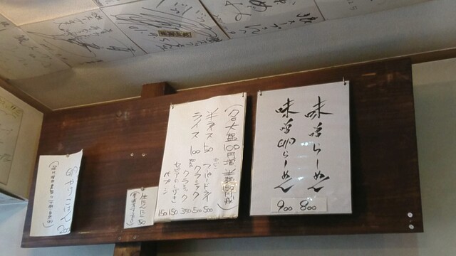 店内はこじんまりとしており、照度控えめに感じられるのは北国のラーメン専門店っぽさを感じる。入ってすぐの所に待合スペースが設けられている。店内を見回すと、サイン色紙は壁だけでは貼り切れず天井にびっしり貼られている。席は左手に6人用と4人用のテーブル1卓ずつ、右手奥にカウンター5席。右手手前は待ち客用の椅子を数脚用意している。卓上に灰皿はなく、一味唐辛子が置かれている。椅子は動かせる丸椅子。BGMは70~80年代のフォークソング中心。