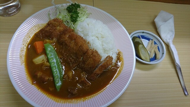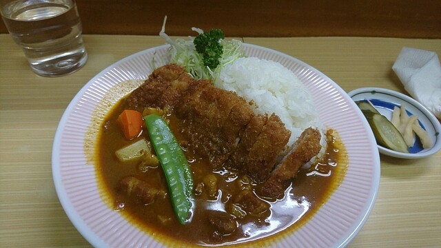 注文から3分後、まず漬物とスプーンが卓上に置かれ、その9分後、リッチなカツカレーのご提供。カレーの脇には千切りキャベツとパセリも添えられている。