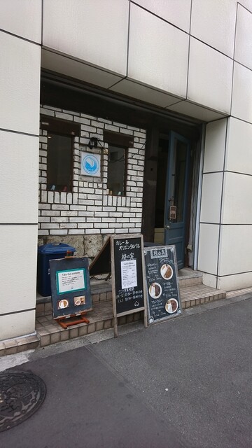 外壁が白いレンガ状の7階建てビル1階にある店で、デニムブルーの扉が印象的。