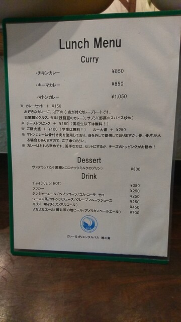 メニューは、「チキンカレー」「キーマカレー」各850円、「マトンカレー」1,050円。ご飯大盛は100円増し、ルー大盛は250円増し、ピクルス・ダル・サブジがつくセットは150円増し。