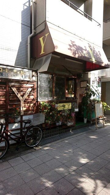 大通り沿いにある店で、店の前に置かれた観葉植物が喫茶店らしさを感じさせる。庇や入口左側の壁に記された「Y」の大きな文字が目を惹く。