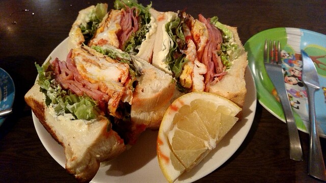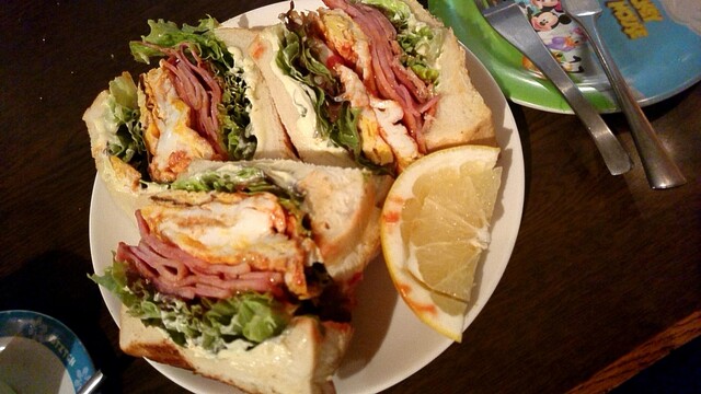 サイズが大きい、具だくさんで持ちにくく持ち上げると具がこぼれそうになる、ケチャップやマヨネーズが垂れそうになると、口に運ぶにあたってはいくつもの難関がある。取り皿も用意されているが、結局手でサンドイッチを持ち上げて口まで運ぶことは断念し、フォークとナイフを使って分解しながら食べ進めることに。