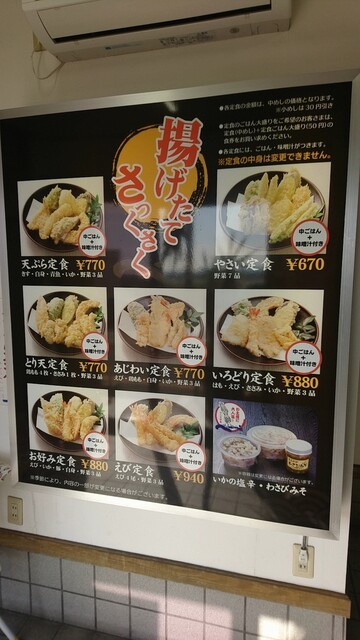 定食メニューは、「天ぷら定食」「とり天定食」「あじわい定食」各770円、「やさい定食」670円、「いろどり定食」「お好み定食」各880円、「えび定食」940円。ごはんを中めしから小めしにすると30円引き、大盛りは50円増し。天ぷら単品での注文も可能。
