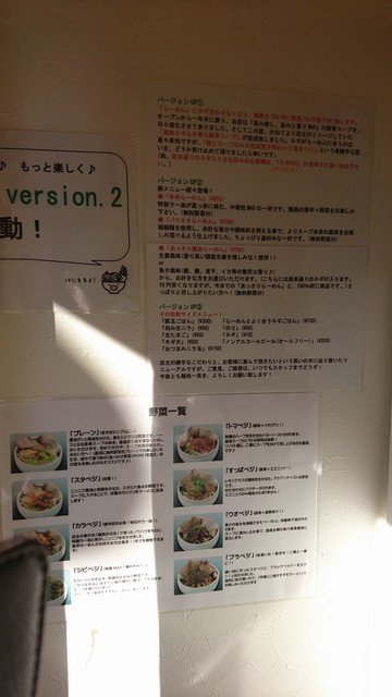 メニューは、「らーめん」「バリカタらーめん」「あっさり醤油らーめん」各790円、「辛辛らーめん」850円。このらーめんは具が入っていないいわゆる素ラーメンで、これに無料野菜トッピングをチョイスして自分好みのラーメンに仕立てるというのがこの店ならではの提供方法。無料野菜は「プレーン」「スタベジ」「カラベジ」「シビベジ」「トマベジ」「すっぱベジ」「ウオベジ」「ブラベジ」という呪文のようなネーミングの8種類から選べ券売機のボタンは0円となっているが、100円プラスで別の種類の無料野菜を追加できる「追っかけ」なる制度もある。ご飯ものも数種類ある。