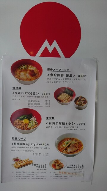メニューは、「魚介豚骨醤油」「札幌味噌EIJI Style」「辛いラーメン」各850円、「EIJIのまぜ麺」小700円・中800円・大900円、「つけBUTO」並830円・大880円・特980円・超特1,080円、「あっさり醤油」「あっさり塩」各800円など。「つけ麺用おじや」100円や「十勝マッシュの餃子」400円などのサイドメニューもあった。