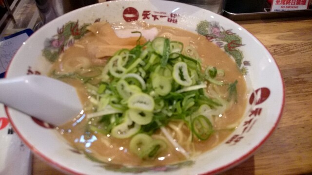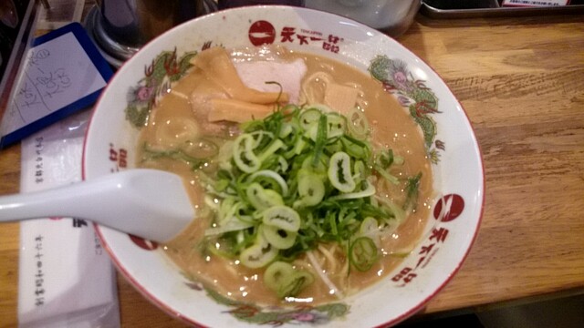 麺はやや細めのストレート麺で、心持柔らかめ。麺の固さは食べ慣れた固さなのだが、他の(特に関東の)天一との比較ではかなり柔らかく感じられ、他店のラーメンとの比較でもやや柔らかめ。このため、固めの麺が好きな人には若干違和感があるかもしれない(特に近年は豚骨ラーメンでも固めを注文する人が増えているだけに)のだが、このこってりと粘度の高いスープとの相性で考えると、微妙な柔らかさがスープの旨味を増幅させてくれる。勿論、麺の固さは調節可能なので好みによって固さを変えることも可能。近年麺のレパートリーを増やそうとしているようでこの日も細麺の提供があったが、やはりこのオリジナル麺が一番。